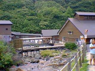 これが駐車場から撮影した建物の側に降りてきたあたりの写真です。左下から斜めに温泉が流れているのですが、この写真では良く分かりませんね。(^_^;)